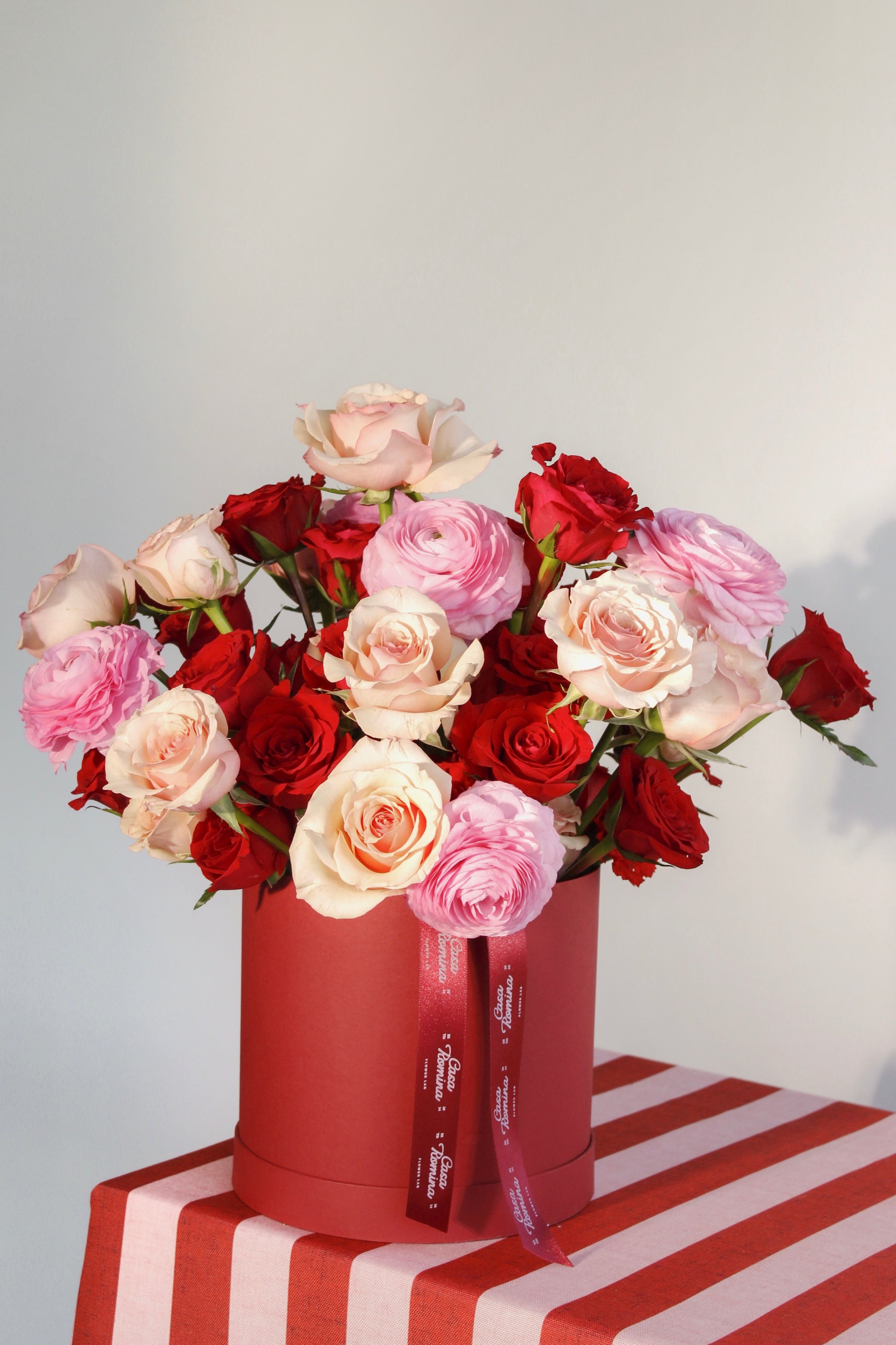 Caja grande con rosas rojas, rosas y renúnculos.